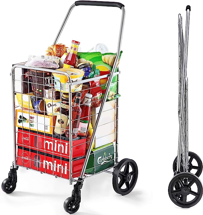 FOLDABLE DESIGN: Our metal collapsible utility cart folds flat allowing you to easily store it anywhere you want. Thanks to its lightweight and foldable design, it’s perfect for use on the go. This foldable shopping cart with wheels is small enough to easily fit inside your car’s trunk making it perfect for use when shopping